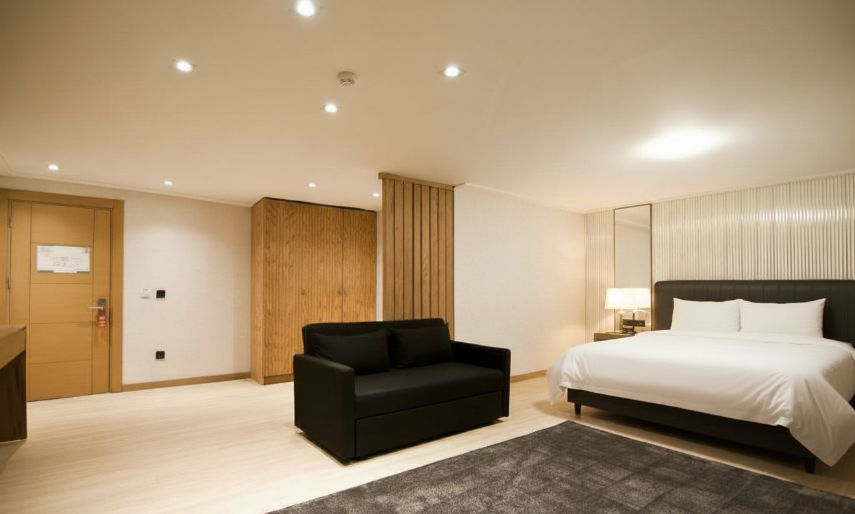 Inside, the suite combines comfort with versatility. Alongside a plush double bed, you’ll find a comfortable sofa bed, making it a perfect choice for families or groups. A stylish sitting area, modern amenities, and large windows ensure the interior feels just as bright and inviting as the terrace outside.